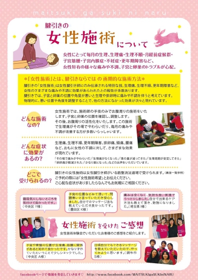 そういった女性特有の不調、不定愁訴に対し腱引きの女性施術をいたします。